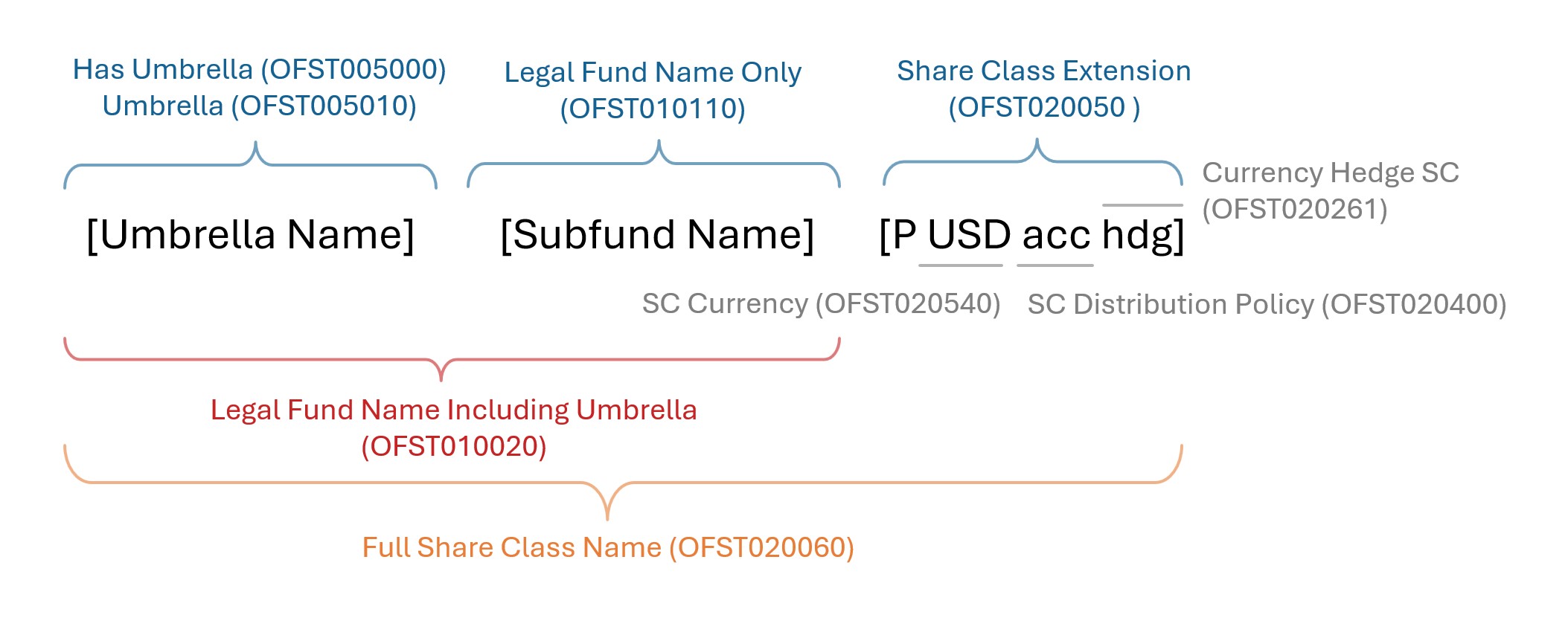 Ultimately the field OFST020060 “Full Share Class Name” comprises the two concatenated fields OFST010020 “Legal Fund Name Including Umbrella” and OFST020050 “Share Class Extension”.